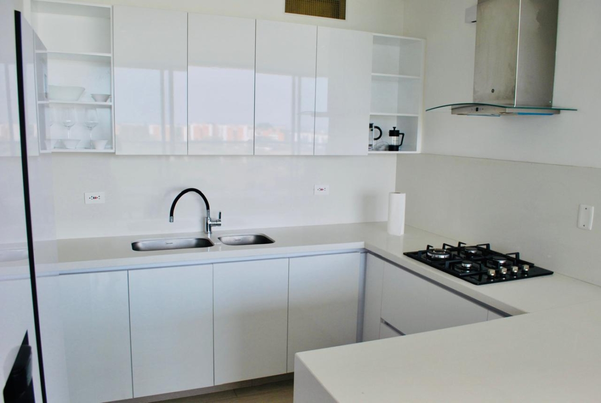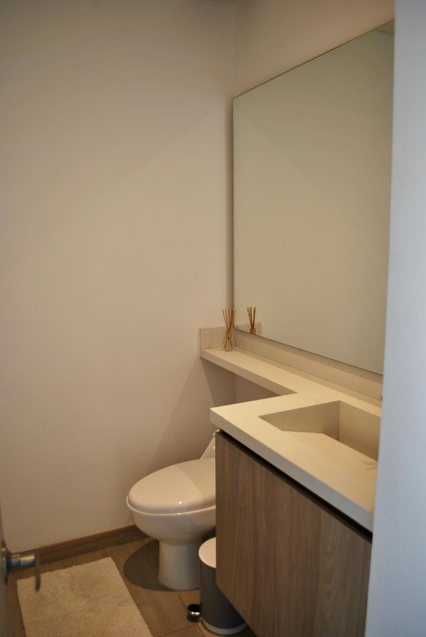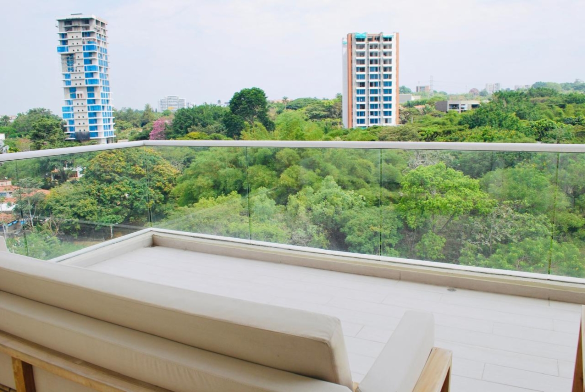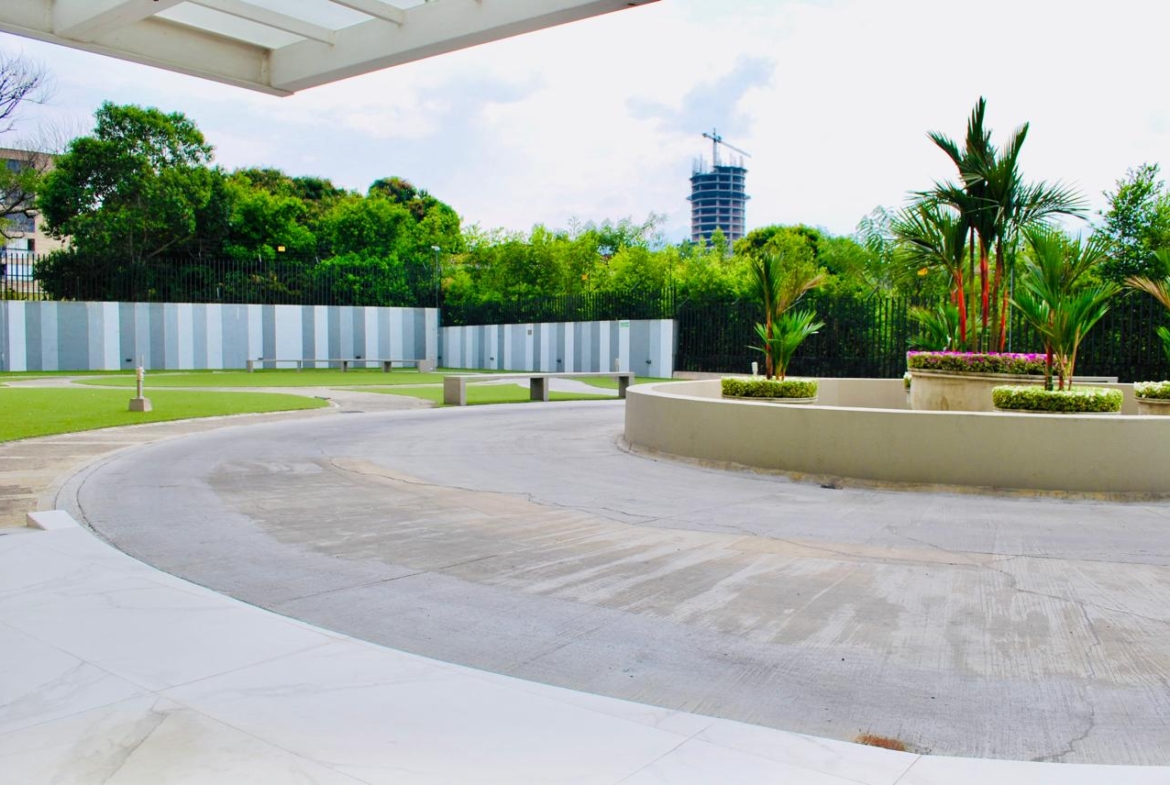 Presenta la siguiente distribución: sala, comedor, balcón de 15 M2, estudio, cocina integral, Dos habitaciones cada una con su baño y un baño social y una terraza lateral de 23.50 M2.