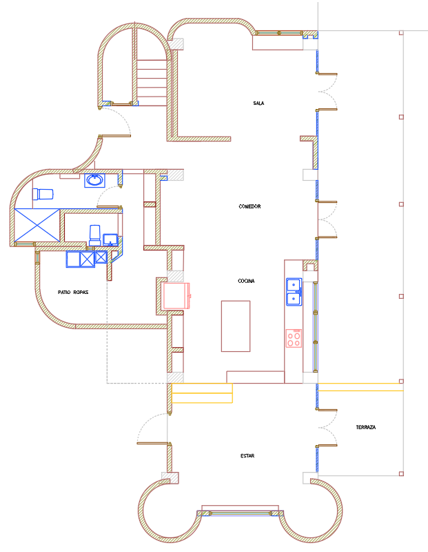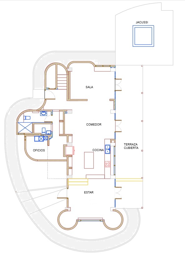 Cuenta con un gran salón alargado donde se encuentra una sala de estar que puede convertirse en un cuarto adicional, empata con una cocina abierta con isla central y vista sobre el valle, comedor auxiliar y remata en una sala de estar con unas volutas simétricas que se enmarcan en la fachada. Todos estos ambientes o espacios colindan con una terraza cubierta como ampliación de los mismos.